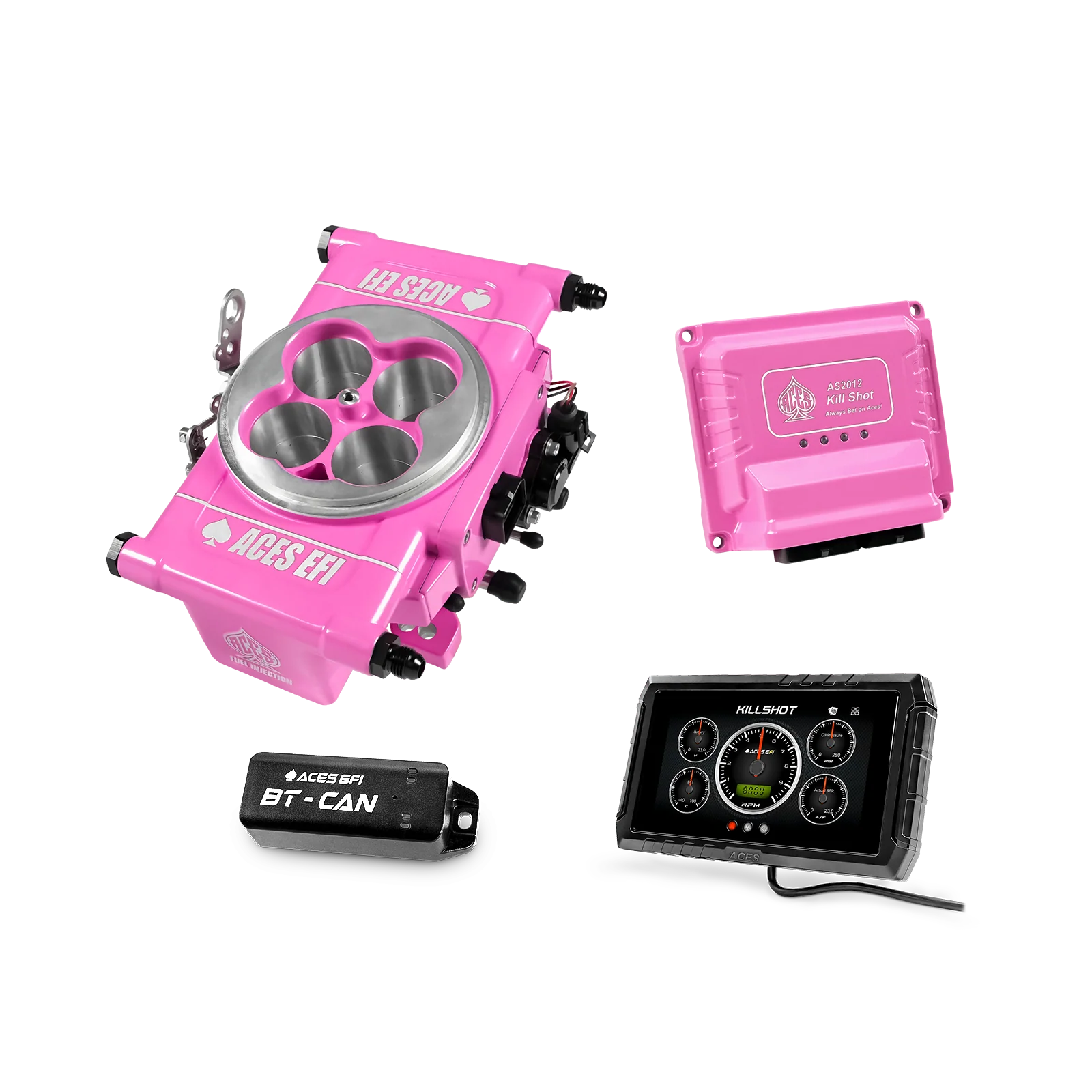 Aces' Killshot EFI system is one of the most advanced throttle body injection (TBI) systems on the market. The Killshot utilizes four 100 lb/hr fuel injectors, giving the system the capability of supporting up to 650 horsepower. The system includes the throttle body (with integrated fuel injectors, TPS sensor, MAP sensor, IAT sensor, and stepper motors), wiring harness, WBO2 sensor, ECU, and a 5” touchscreen handheld programmer for easy tuning and monitoring of engine data.Â